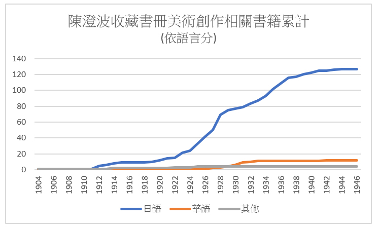 這三條曲線暗示了他的人生軌跡:1924至1928年日語藏書部份有較快的成長(最陡處),這正是他在日本內地求學的時期;在1929年華語藏書量趕上了西方語言藏書,而他正是在這一年移居上海;1933年起華文書即不再增加,他就是在這一年搬回台灣;1941年之後藏書冊數的增加幅度近乎停滯了,台灣島也的確在這一年開始嚴重感受到戰爭壓力。陳澄波藏書的出版年度與生命軌跡如此相符,這說明了一件事:陳澄波絕大多數是以新書入手。