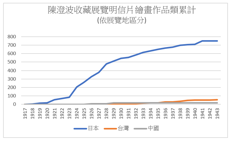 展覽專輯可以讓我們知道藝術家逛了(或至少是關注)哪些展覽,而展覽明信片則更進一步告訴我們:哪些類型與風格的作品是藝術家所欣賞的,每一筆展覽明信片的入手都代表陳澄波用日幣進行了投票。和書冊有可能是受贈的情況不同,明信片比較有可能是自行消費(我們不將郵局寄來的明信片納入研究樣本),至少,它們沒有被當成真的明信片寄出,這意謂著陳澄波想一直留在手邊。