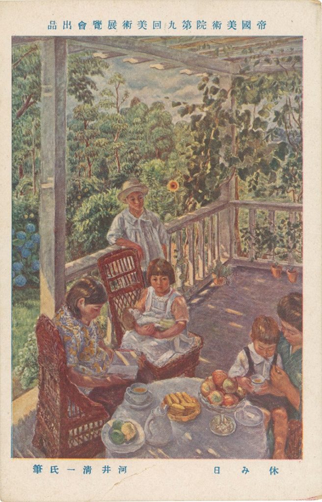 一直到強調即時所見的印象派出現,人們才知道去補捉透過樹葉流瀉而下的點點光斑,Pierre-Auguste Renoir(雷諾瓦)的《煎餅磨坊舞會》(圖1)是其中一個知名案例,點點光斑灑在人物與地面上,活潑了富裕家庭戶外享用茶點的日常場面,像是把幸福感給閃閃發亮了。河井清一 的 《假日》(1928第九回帝展,圖2)採用了同一手法,其中人物穿著、建築設計、餐具與家具以及茶點活動的描寫,讓我們一探當時日本社會閒適階級的西化程度。