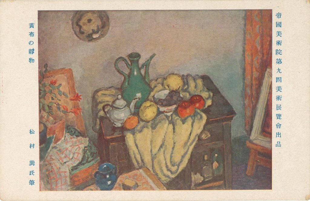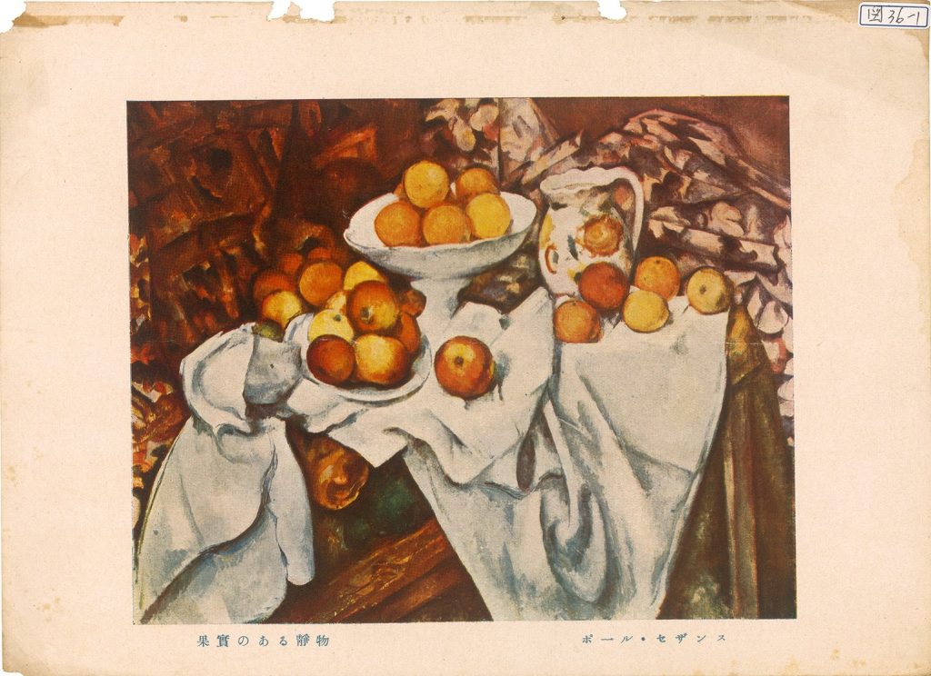 另一例:日本畫家松村巽的 《黃布上的靜物》(1928第九回帝展,圖5),此靜物畫中桌布與水果的構圖擺放,與Cézanne (塞尚)經典的靜物畫構圖神似(如圖6),這二件作品明信片同時出現在陳澄波的收藏裡。