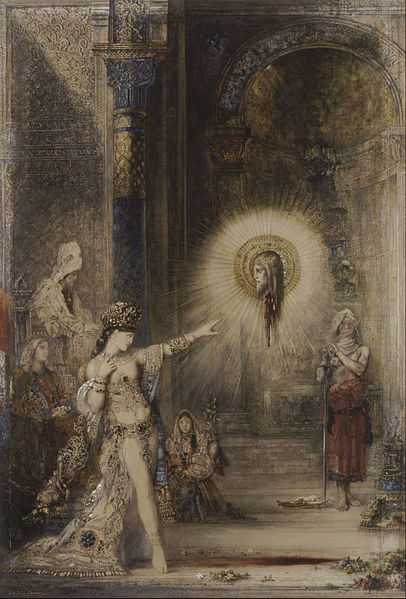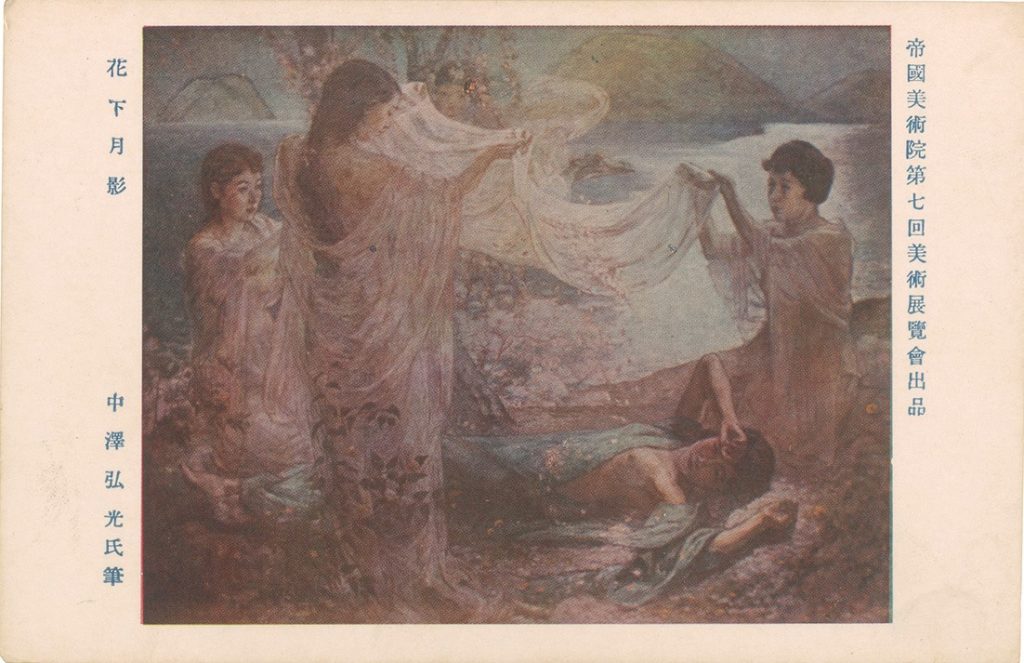 另一種象徵主義路線也被陳澄波所蒐藏:中澤弘光的《花下月影》 (1926第七回帝展,圖9),畫面敘事非夢境,而似在進行某種神秘儀式;就其濃烈神秘氛圍部份,會讓人想到法國象徵主義大師Gustave Moreau的莎樂美主題的畫作(圖10)。