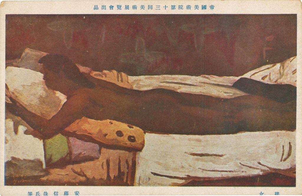 後期印象派大師Paul Gauguin(高更)的名作《亡靈看守著》(圖14)中大溪地裸女姿態太經典了,以致於當安藤信哉的《裸女》(1932第十三回帝展,圖15)也出現深膚色橫趴裸女,很難不讓人將二者作聯想。只是,安藤信哉僅仿效構圖、色彩運用等美感語言,《亡靈看守著》那神秘氛圍是日本藝術家未能或無意觸及的。