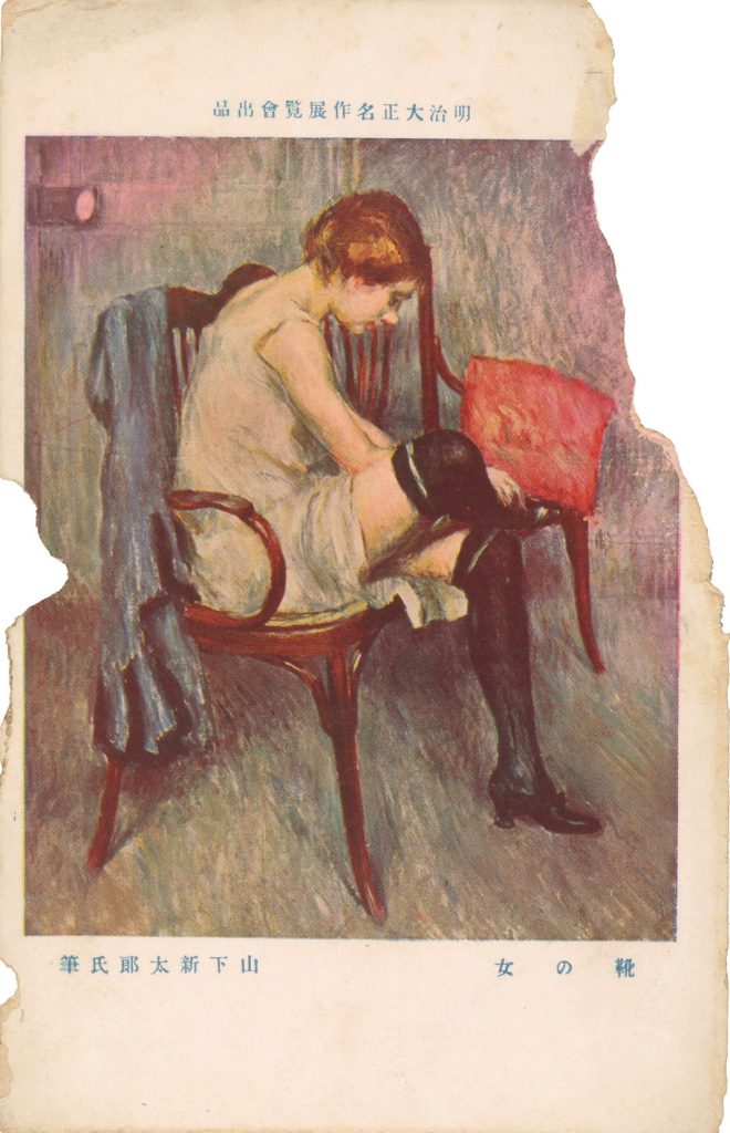後期印象派的法國藝術家Henri de Toulouse-Lautrec(羅特列克)擅長描繪聲色場所營生的女子生活,公開生活場景或與私密皆有。正逢康康舞流行年代,Toulouse-Lautrec(羅特列克)有不少以著黑絲襪女性為焦點的作品。山下新太郎的《穿鞋的女人》(1927明治大正名作展覽會,圖16)描繪了處於私密氛圍的女性,與Toulouse-Lautrec(羅特列克)所擅長的女性主題(圖17)有著神似之處。