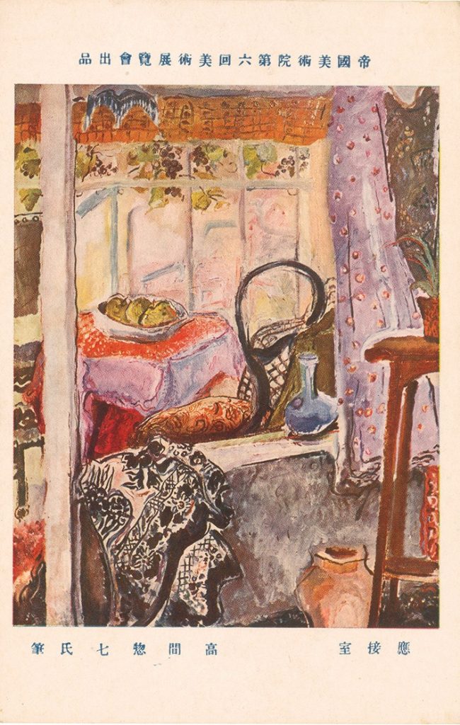 色彩魔術師Henri Matisse(馬諦斯)有不少室內畫(圖 18、19),常見這樣的安排:色彩繽紛且明亮的空間、有著主題紋飾的牆、線條有點繁複傢俱、隨意披掛的花布…,這些元素均出現在高間惣七的《會客室》(1925第六回帝展,圖20)。