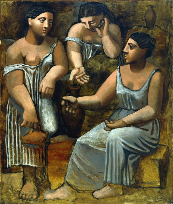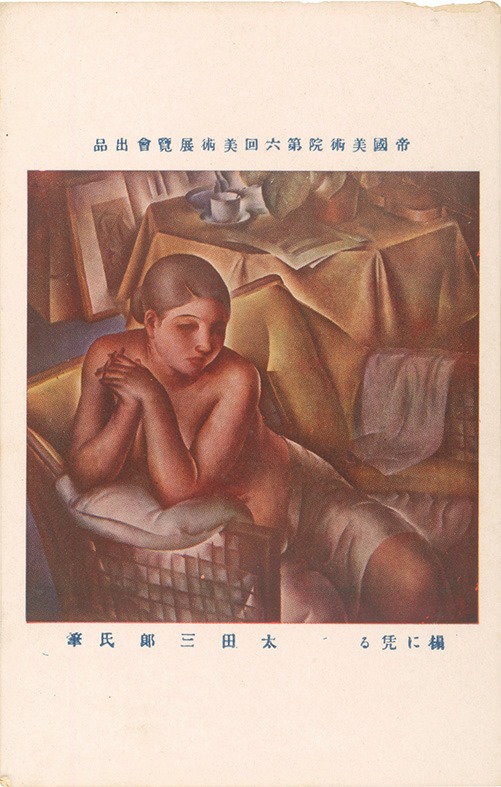 強烈光影對比加上節制用色,太田三郎的 《倚坐》(1925第六回帝展,圖1)明顯運用了立體派手法來處理畫面的各個部位,該手法可見於Pablo Picasso(畢卡索)在前期立體派時期的柱狀人物構成(圖2)。