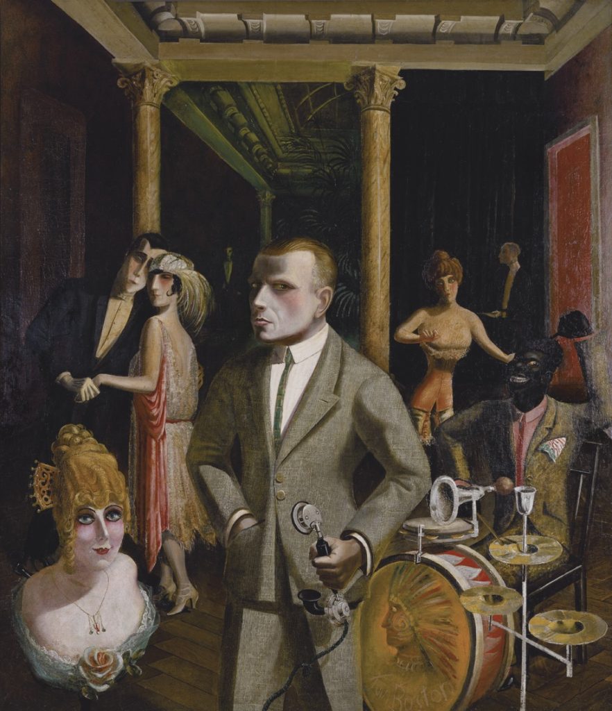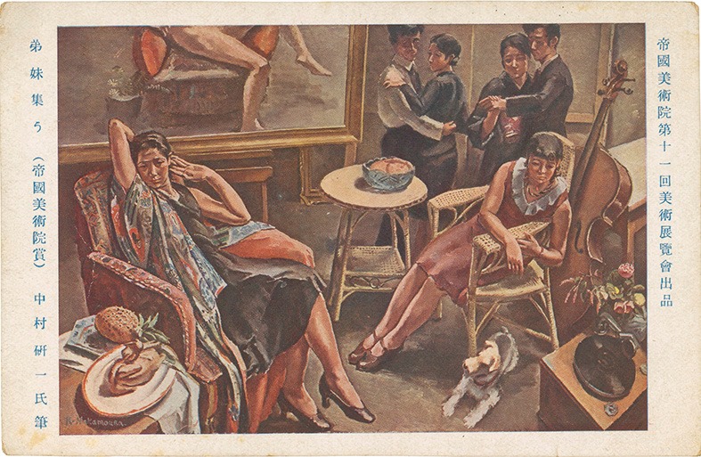 戰前德國表現主義的藝術家經常呈現一種對時代前景的悲觀態度,即使描繪了唱歌跳舞的歡聚場面,總還是會帶著一種灰色的暗示:大難即將來臨。這批作品不是由形式、而是由主題內容來製造出一種不協調感,光鮮亮麗與怪異、扭曲、不安、冷漠遺世等負面情緒被扭曲成一團,可見如Ernst Ludwig Kirchner的《柏林街景》(圖8),或是 Otto Dix的《致美人》(圖9)。日本藝術圈必然也注意到此流派,中村研一的 《弟妹們的聚會》(1930第十一回帝展,圖10)即是一例,看似歡樂的親友聚會場合:跳舞著、音樂環繞著,但畫面中,左邊女子姿態怪異彆扭,後方共舞的男女們不太自然盯著觀眾,畫架上畫作是極為大膽的裸女跨坐沙發,僅露出部份;不安不斷滲出,是一件很成功的表現主義畫作。