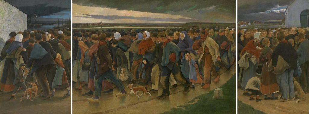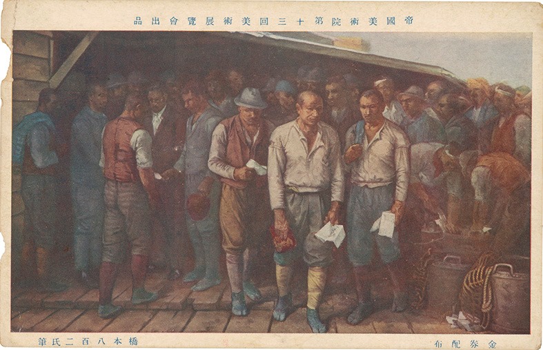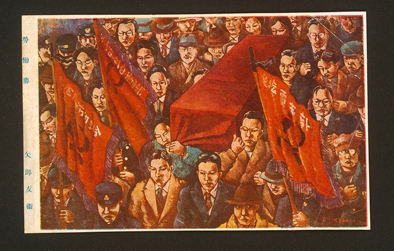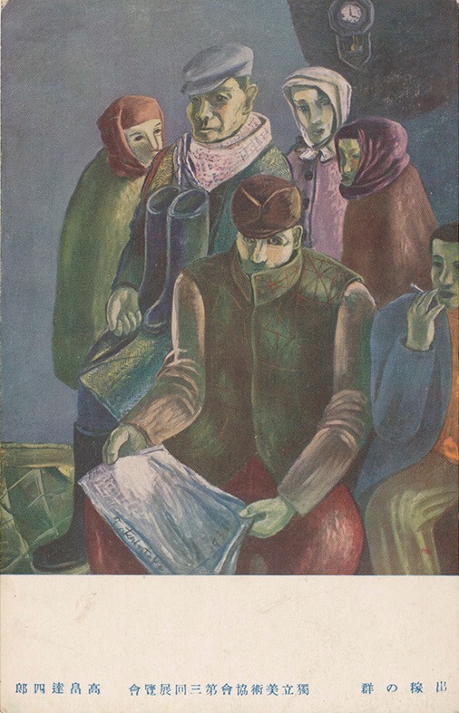 陳澄波所收藏的日本洋畫家作品明信片,也有許多銜接上這個西歐社會的寫實主義路線;比如描繪勞工日常的橋本八百二 《發放代金券》(1932第十三回帝展,圖14)、描寫移工的高畠達四郎 《離鄉打工的人們》(1933第三回獨立美術協會展覽會,圖15)、矢部友衛 《罷工》(1930第十一回帝展,圖16)等等都是。