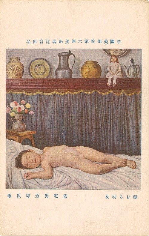 安宅安五郎的 《熟睡的小女孩》(1925第六回帝展,圖19)在用色、構圖以及寫實手法都極符合古典美感,但裸體小女孩並沒有傳達出可愛與溫馨感:如那些古典西畫中裸體小天使所呈現的,而是讓寧靜氛圍中飄出一絲詭異感,這種詭異可能來自女童的裸體描寫以及其一種並不安詳的熟睡姿勢。