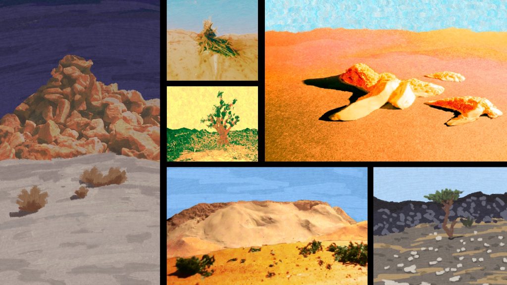 為了呈現我們在真實世界看過的「真實」,我們參考了大量的縮時攝影素材,觀察在各種不同的時間和天氣下,太陽和影子如何變化和移動、沙漠和台灣綠油油的樹林有何區別、以及色彩如何因天氣不同而改變。特別是傍晚時分,天空和沙漠冷暖交替的柔和色彩,我們都盡可能地呈現在紀念碑的動態中。