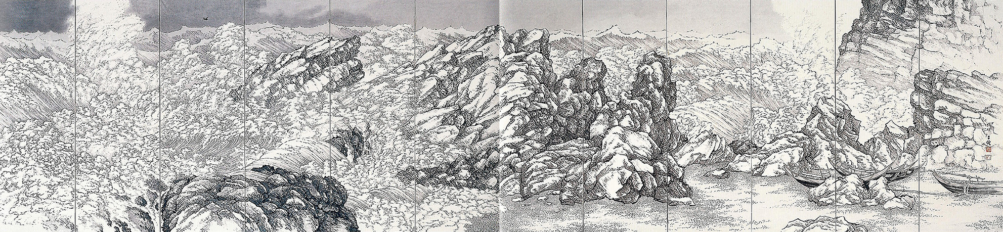 與鹽月桃甫同為臺展審查員的鄉原古統,在他的〈臺灣山海屏風 北關怒潮〉當中,以六曲一雙的宏大尺幅,表現宜蘭北關兇猛的浪濤。此作放低了視點並以細碎的筆觸點出滔滔的海浪,讓觀眾彷彿身歷其境,感受黑潮撞擊礁岩所噴灑出的浪花與的激響,震撼人心。