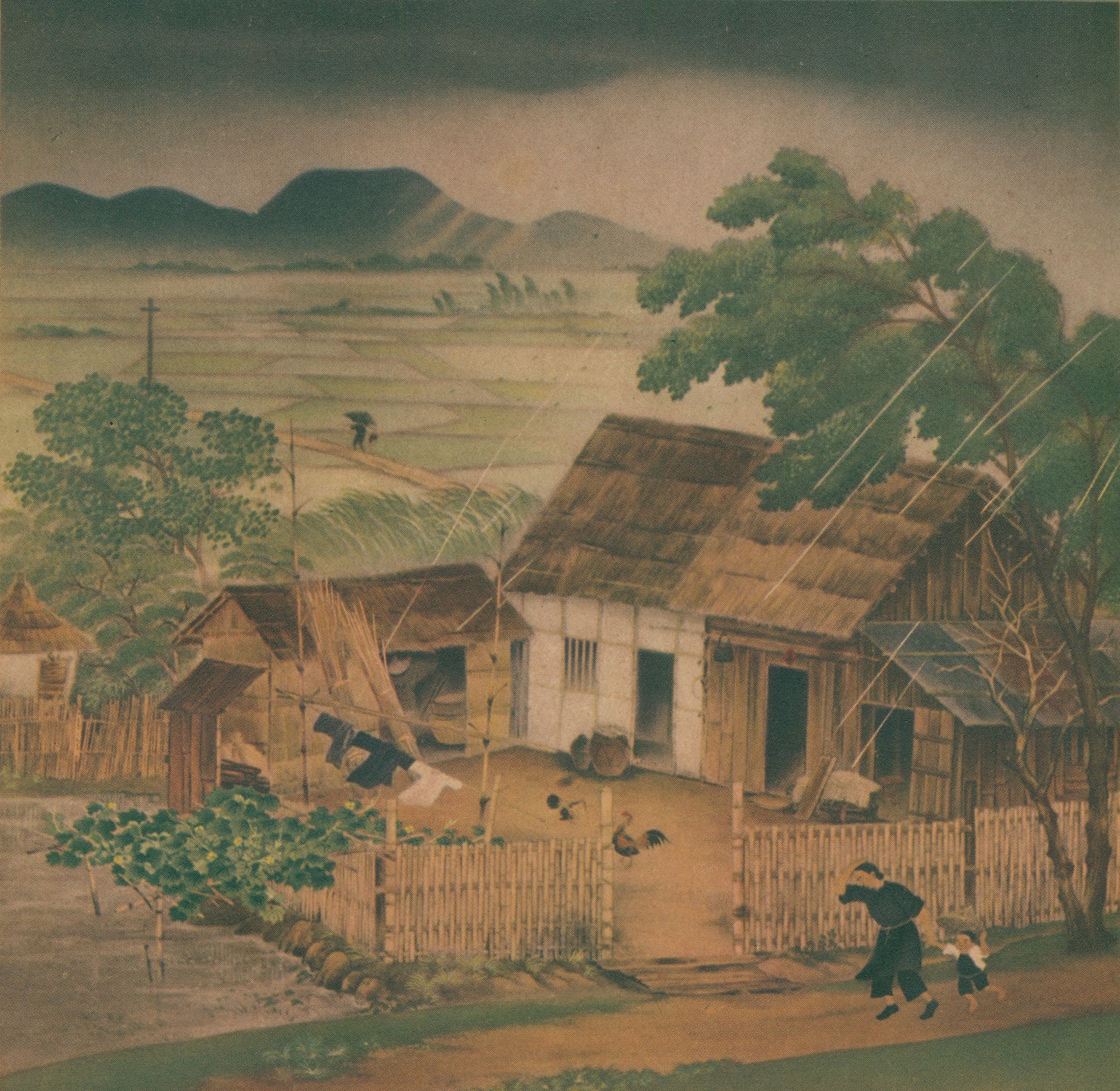 島嶼的另一頭,自海而來的西南季風為臺灣的西半部帶來豐沛水氣,形成如降水、積雲、下雪等多樣的天氣面貌。林玉山的〈驟雨〉精準地掌握天色驟變、雨水直落的景象,畫面右下角一對奔跑的母子,顯然是未料突然下雨而遮著頭趕緊回家。這件作品曾得到評論者的稱讚:「努力繪製有臺灣味的畫,這點很值得肯定。」可知所謂的「臺灣味」,或許也包含了經常下雨的氣候特色。