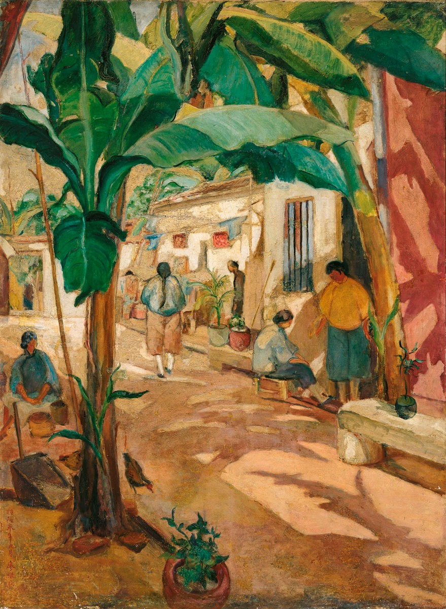 待到大雨過後,太陽探頭,炙熱的陽光再度照耀大地。廖繼春〈有香蕉樹的院子〉使用暖黃色調鋪展畫面,直挺的香蕉樹伸出大片的樹葉,盡情享受著溫煦的日照。而樹下的陰影則成了人們乘涼的好所在,畫中人物或坐或立,也許正盼著一股宜人的清風。此作是廖繼春首度入選帝展的作品,前一年陳澄波二次入選的〈夏日街景〉,亦營造出臺灣夏季炎熱的氛圍,這大概是遠在溫帶地區的日本人難能體會的感覺,為時值秋季的帝展添上一些暖意。