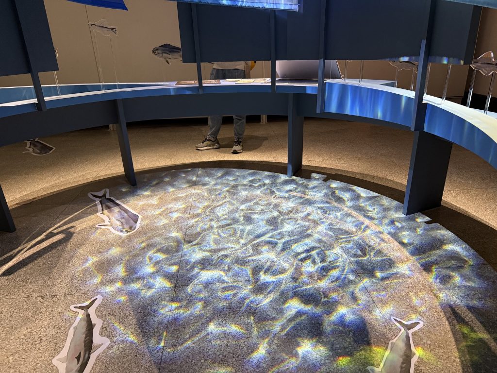 在這次特展中,第三展間也進一步透過劍旗魚、鬼頭刀等魚類的地貼與壓克力展示,生動地呼應了黑潮與台灣海洋文化的深刻連結。