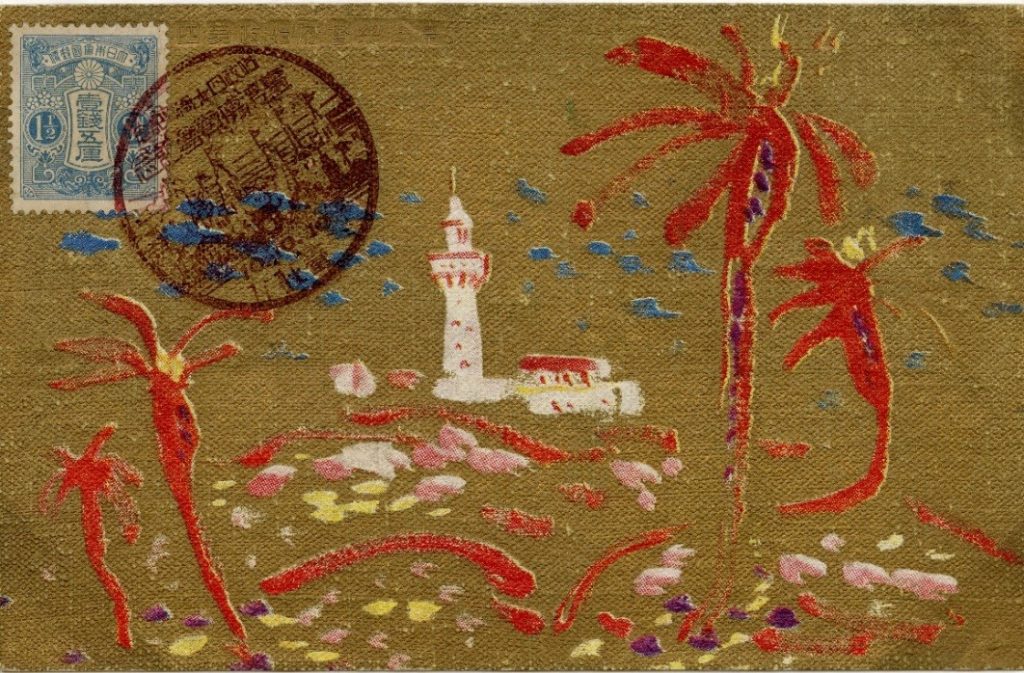 在這份描繪臺灣鵝鑾鼻的明信片中,鹽月桃甫繪製了如河流般的魚群,象徵黑潮為南臺灣帶來的生機。