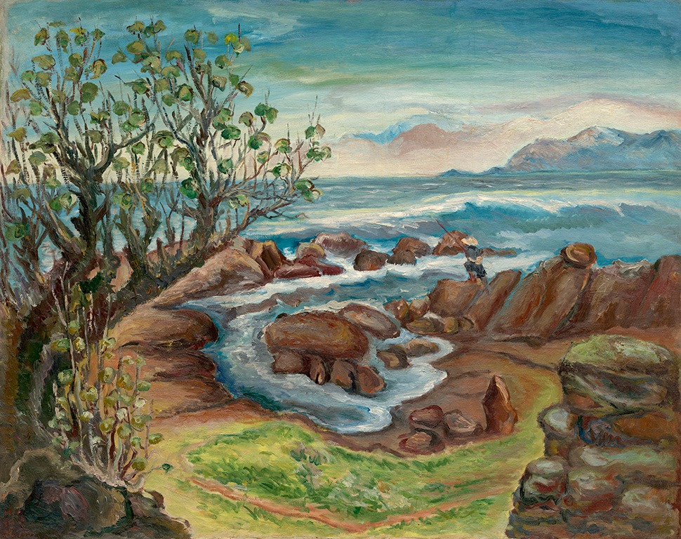 隨著黑潮再往北,來到陳澄波的〈濤聲〉,在這幅畫作裡你看見什麼呢?也許是畫面左半邊那棵巨大、直達天際的樹木,原來,這棵種植在岸邊的樹木是台灣沿海時常種植的防風植物黃槿,它不僅是台灣特有的沿岸風景,黃槿的葉片在傳統台灣社會中,更時常被拿來做為蒸粿的襯葉呢!許多看展的觀眾一聽到黃槿、紅龜粿,都忍不住露出會心一笑。
