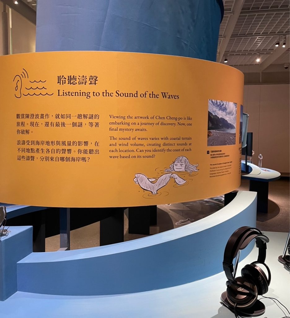 除了沿岸景色,你是否也好奇來到沿岸的畫家們聽到了什麼聲音?在第三展間最末,特別設計了「聆聽濤聲」的裝置,邀請大家拿起耳機,聽一聽畫家們作畫現場的環境音。聆聽過程中,你的腦海是否也浮現〈濤聲〉中一波波向前汩動的白浪呢?